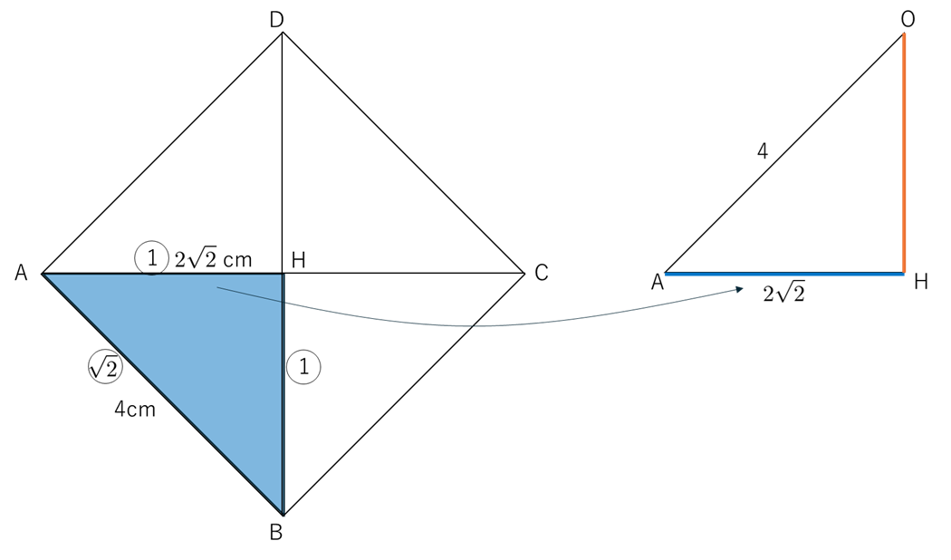 問題1と同様に、点 $\mathrm{O}$ から底面に下ろした垂線の足を $\mathrm{H}$ とします。問題1の正四角錐は 1 辺が 4cm でしたが、今回はその 2 倍なので、高さも 2 倍になります。