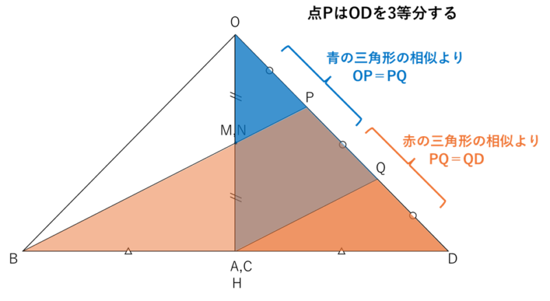 - $\mathrm{P}$ が $\mathrm{OD}$ を三等分することは、相似で理解できる。