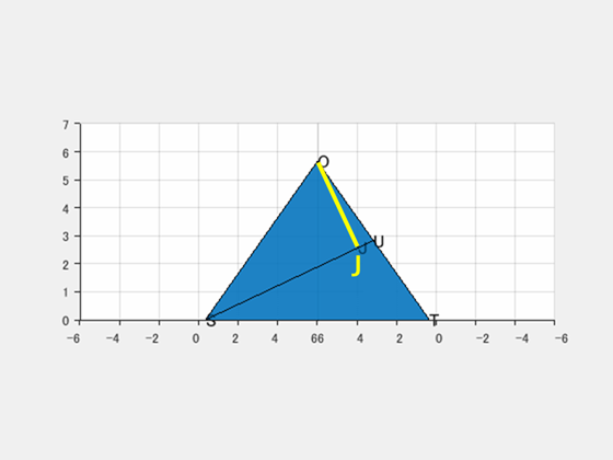点 $\mathrm{S}$ を原点とする座標平面で考えます。すると、(1)(2) の結果から点 $\mathrm{O}$、$\mathrm{T}$、$\mathrm{U}$ の座標が決まります。