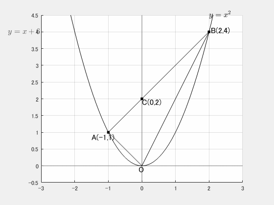 $\triangle\mathrm{OAB}$ と同じ面積になる $y=x^2$ 上の点の座標は?(底辺 $\mathrm{AB}$ はそのまま)