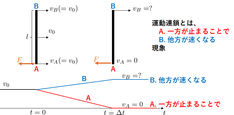 「急激($\Delta t$の間)に速度 $v_A=0$ にした」というのは、ここでは簡単のため $t=0$ から $t=\Delta t$ の間、一定の力 $F$ を加えて実現していると考えます。