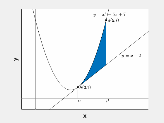 S &=& \int_\alpha^\beta \{(x^2+bx+c)-(px+q)\}\,dx\\