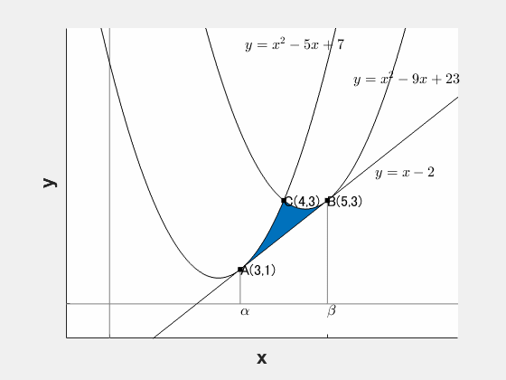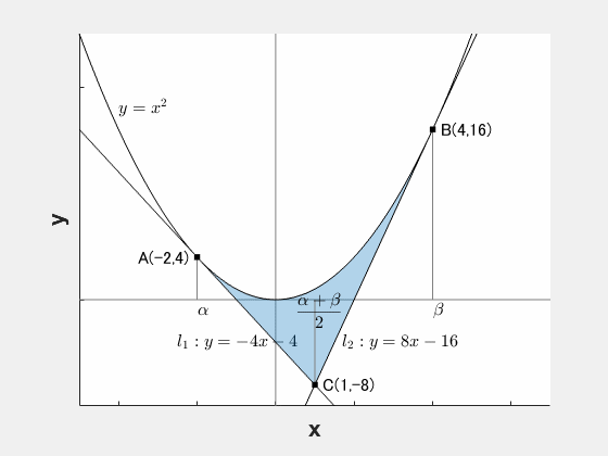 を $\alpha$ から $\beta$ まで積分すればよいです。このとき、接線の性質から放物線と直線との差は