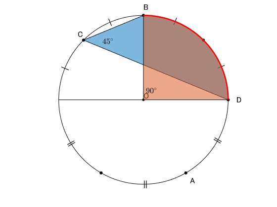 弧 $\overset{\frown}{\mathrm{BD}}$ の円周角は $45^\circ$