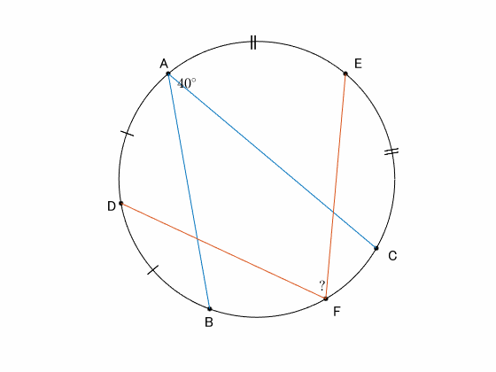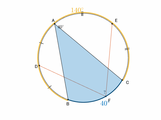 弧 $\overset{\frown}{\mathrm{BFC}}$ の円周角 $\angle\mathrm{BAC}=40^\circ$ より、その反対側の弧 $\overset{\frown}{\mathrm{BAC}}$ の円周角は $140^\circ$ である。