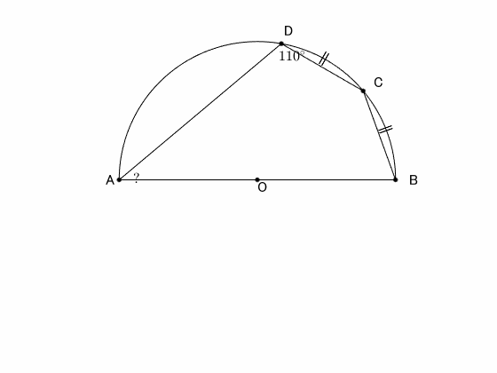 $\angle\mathrm{ADC}=110^\circ$ は半円に弧 $\overset{\frown}{\mathrm{BC}}$ を加えた円周角であるから、弧 $\overset{\frown}{\mathrm{BC}}$ に対する円周角の大きさは、