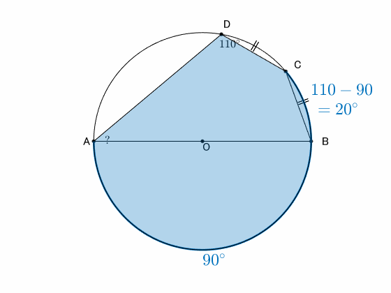 半円の円周角は $90^\circ$ です。$\angle\mathrm{ADC}=110^\circ$ は半円に弧 $\overset{\frown}{\mathrm{BC}}$ を加えた円周角であることに気づけばOKです。
