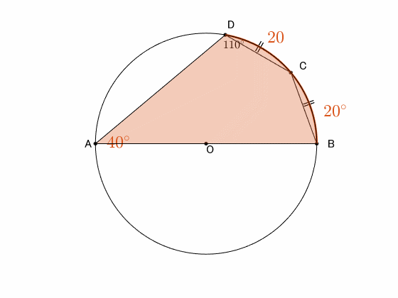一方、求めたい角 $\angle\mathrm{BAD}$ は弧 $\overset{\frown}{\mathrm{BC}}=20^\circ$ の2倍の弧長の円周角なので、