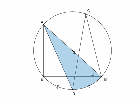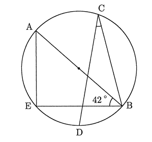 下の図のように $\mathrm{AB}$ を直径とする円があり、$\overparen{\mathrm{BD}}=\overparen{\mathrm{DE}}$, $\angle\mathrm{ABE}=42^\circ$ である。$\angle\mathrm{BCD}$ の大きさを求めなさい。