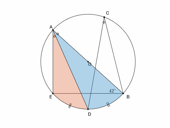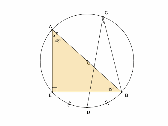 ここで、$\triangle\mathrm{BAE}$ は直角三角形なので、$\angle\mathrm{ABE}=42^\circ$ とから、