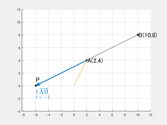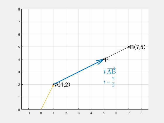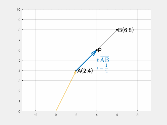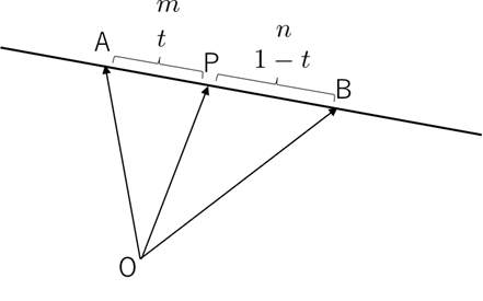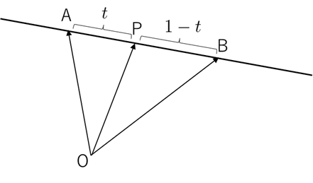$$\overrightarrow{\mathrm{OP}}=(1-t)\,\overrightarrow{\mathrm{OA}}+t\,\overrightarrow{\mathrm{OB}}\tag{1:再掲}$$