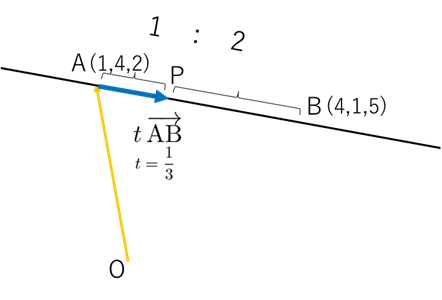 例題3:3次元の内分点 A(1,4,2), B(4,1,5) を 1:2 に内分する点