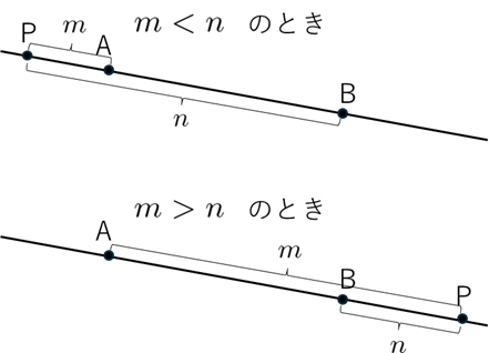 点 $\mathrm{A}$ と点 $\mathrm{B}$ を結ぶ線分の「間」に点 $\mathrm{P}$ があり、比 $m:n$ に応じて位置が決まります。