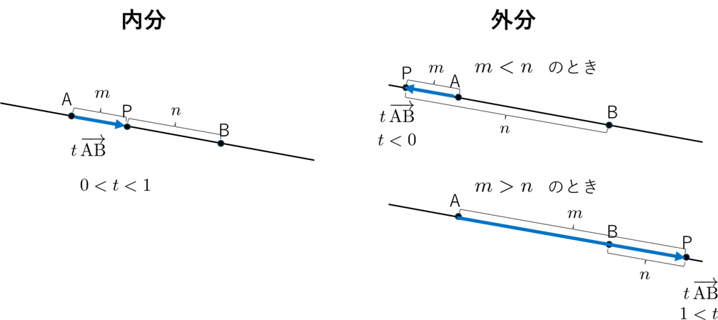 左が内分点、右が外分点です。内分点は線分 $\mathrm{AB}$ の「間」に、外分点は「外側」に位置します。